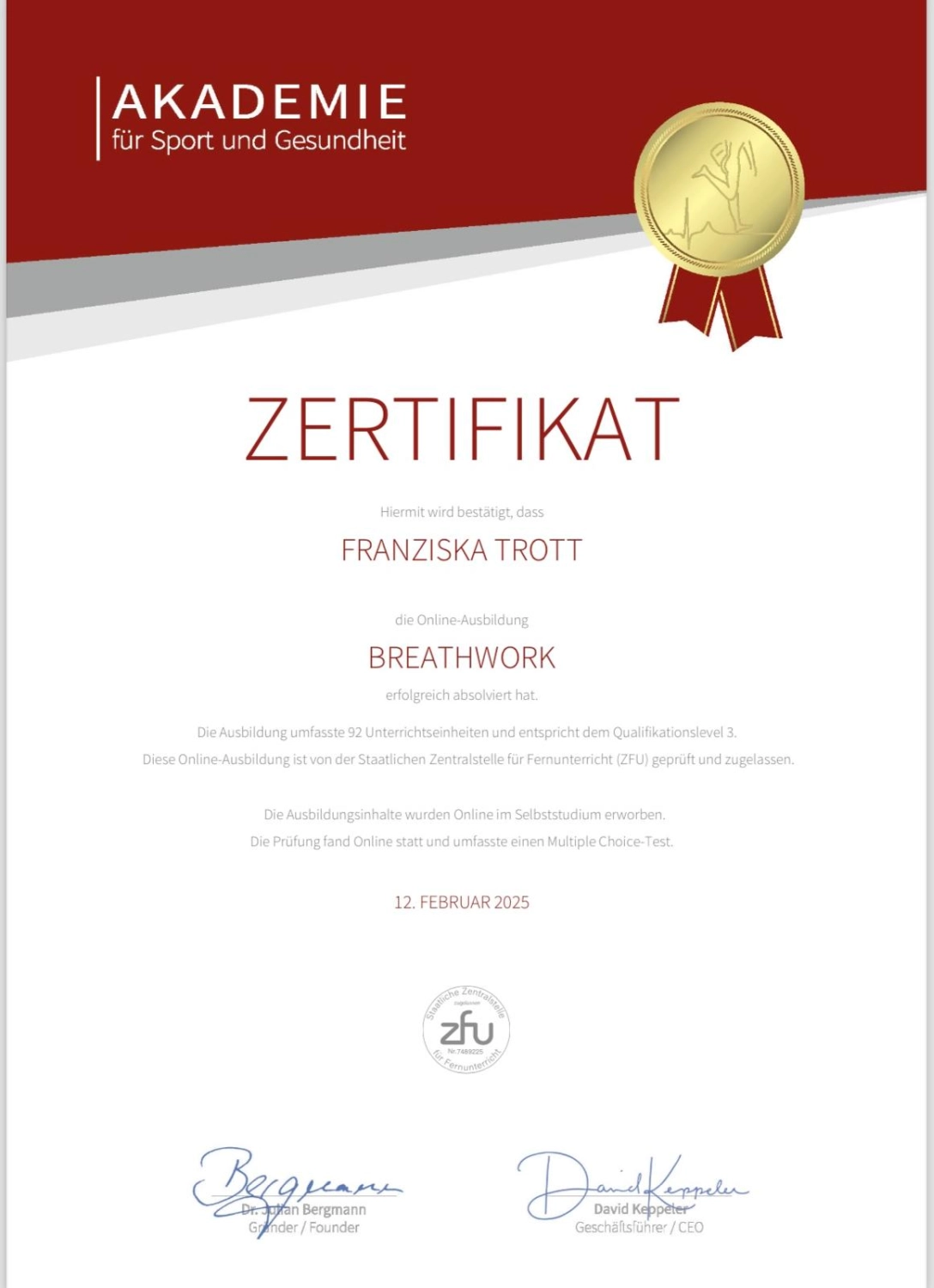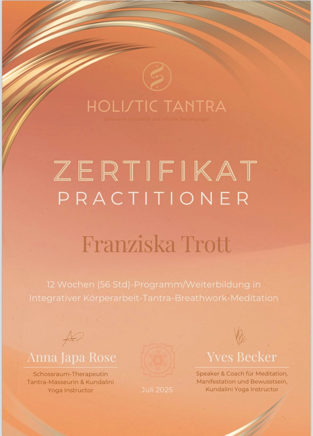 Mein Name ist Franziska Trott. Ich arbeite seit vielen Jahren zusammen mit meinem Mann im Bereich Fitness/Gesundheitssport & Ernährung. Wir begleiten unzählige Menschen auf ihrem Lebensweg und unterstützen sie dabei, ihre Ziele, wie z. B. Schmerzfreiheit, Wunschgewicht oder Steigerung der Lebensqualität, zu erreichen. Doch obwohl ein Großteil sein lang ersehntes Ziel erreicht, fällt immer wieder auf, dass viele Menschen oft nur kurzfristig glücklich/schmerzfrei oder einfach nur erleichtert sind. „Woran liegt das?“ Diese Frage stellte ich mir immer wieder, bis ich auf den Vortrag „So verstehst du deine Seelenaufgabe“ gestoßen bin. Ich wusste sofort: „Das muss die Antwort sein!“ Seitdem habe ich mich 2 Jahre lang mit großer Begeisterung von Randolf Schäfer zum zertifizierten Archetypen-Coach ausbilden lassen und lernte zu verstehen dass es ein viel tieferes Verständnis braucht, um die Ursachen aller Probleme an der Wurzel zu packen.